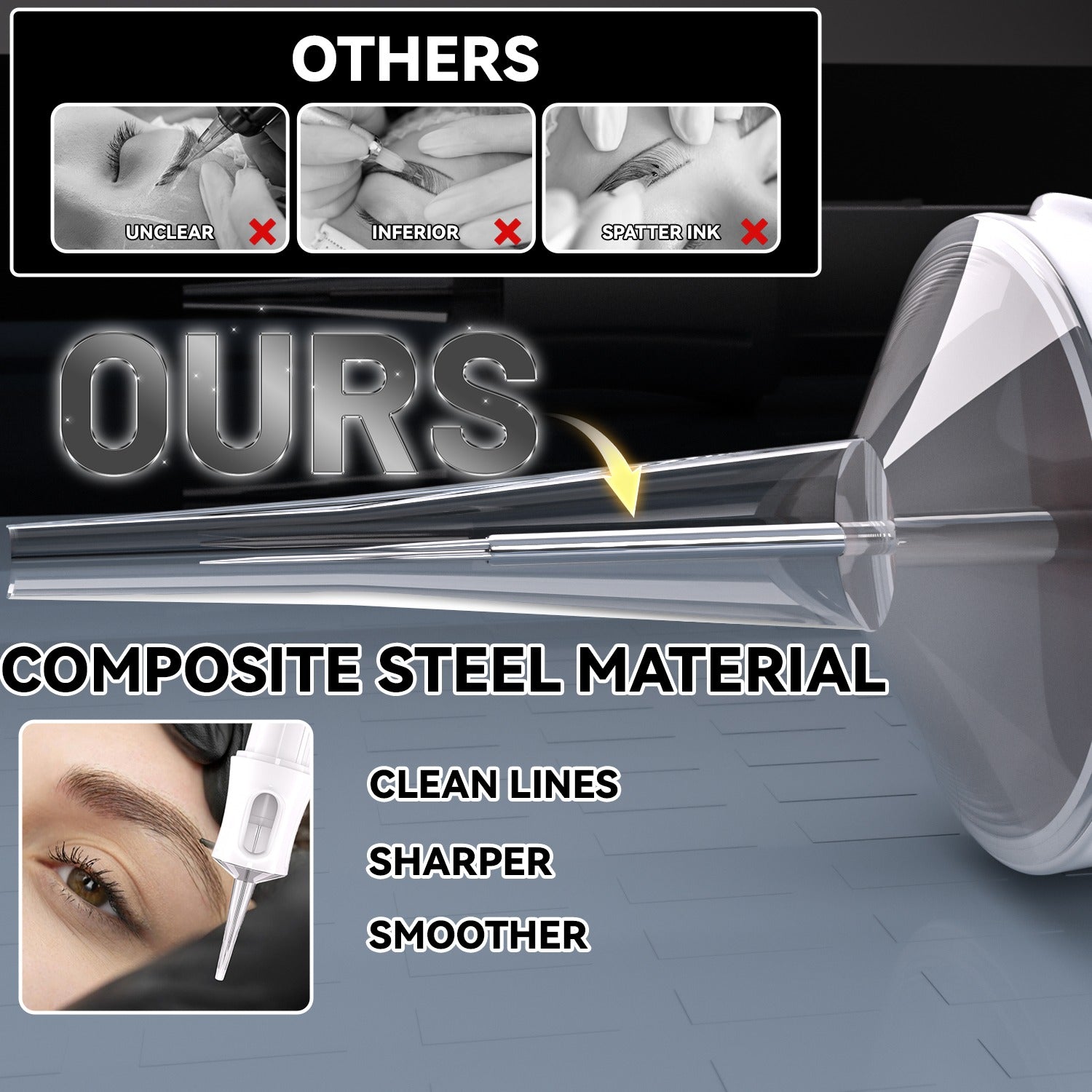 - 2. Esta aguja nano de cartucho es ideal para crear los trazos de pelo de cejas más finos para procedimientos Nano Brow, delineado de ojos más fino o para la precisión de trabajos de tatuaje detallados.