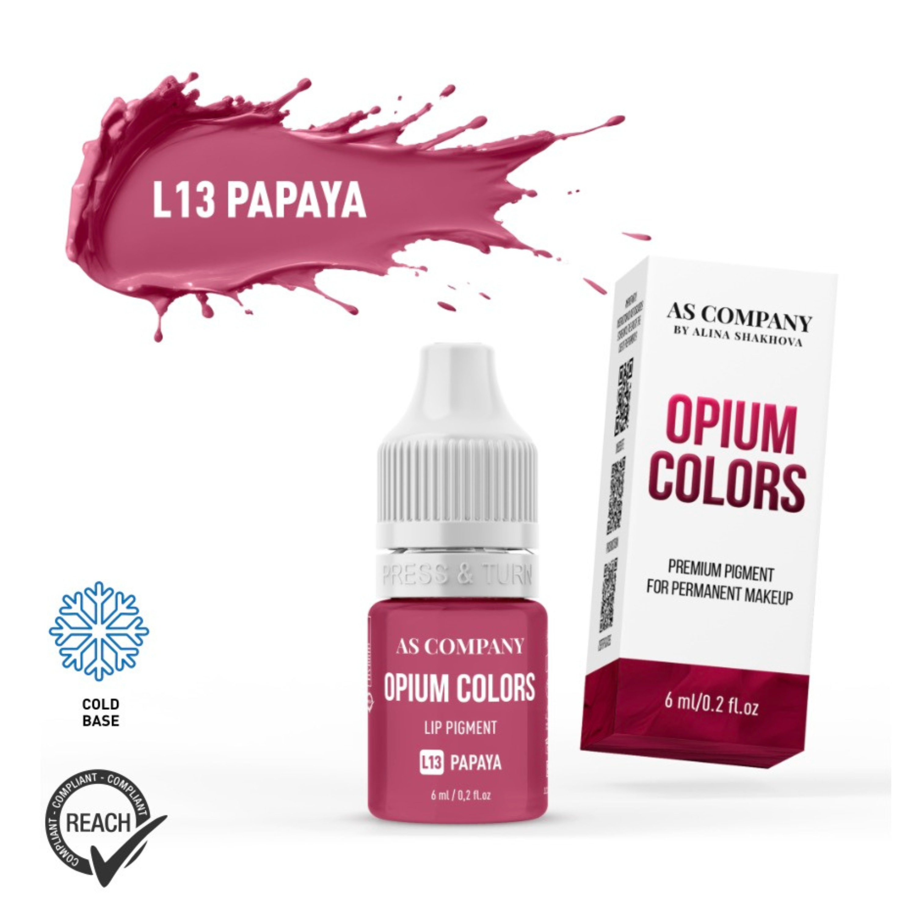 L13 PAPAYA – pigmento híbrido. Color ciruela fría con base fría. Adecuado para pieles cálidas y frías. Pigmento autosuficiente. Puede combinarse con colores cálidos y neutros.