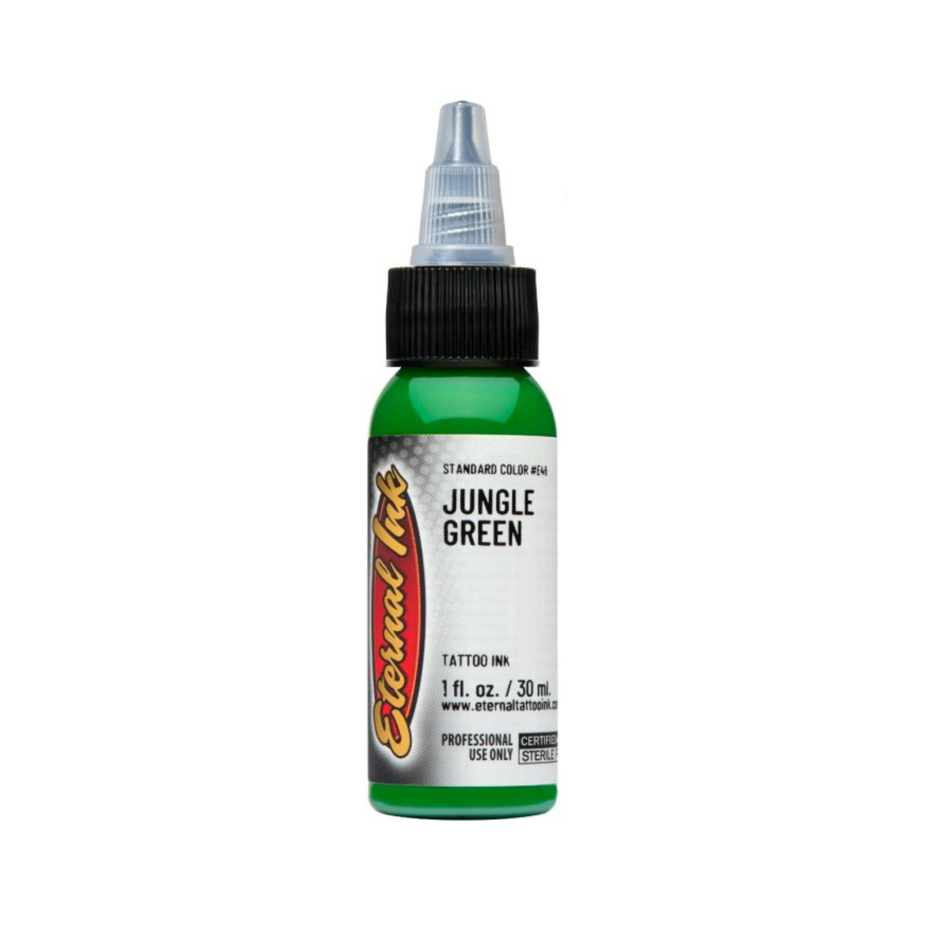 Además, todas nuestras tintas se esterilizan mediante tecnología de radiación gamma, un proceso que elimina cualquier bacteria potencialmente dañina, minimizando así el riesgo de irritaciones, reacciones alérgicas o infecciones. Esta combinación de seguridad, calidad y rendimiento convierte a Jungle Green en una excelente elección para cualquier artista del tatuaje.