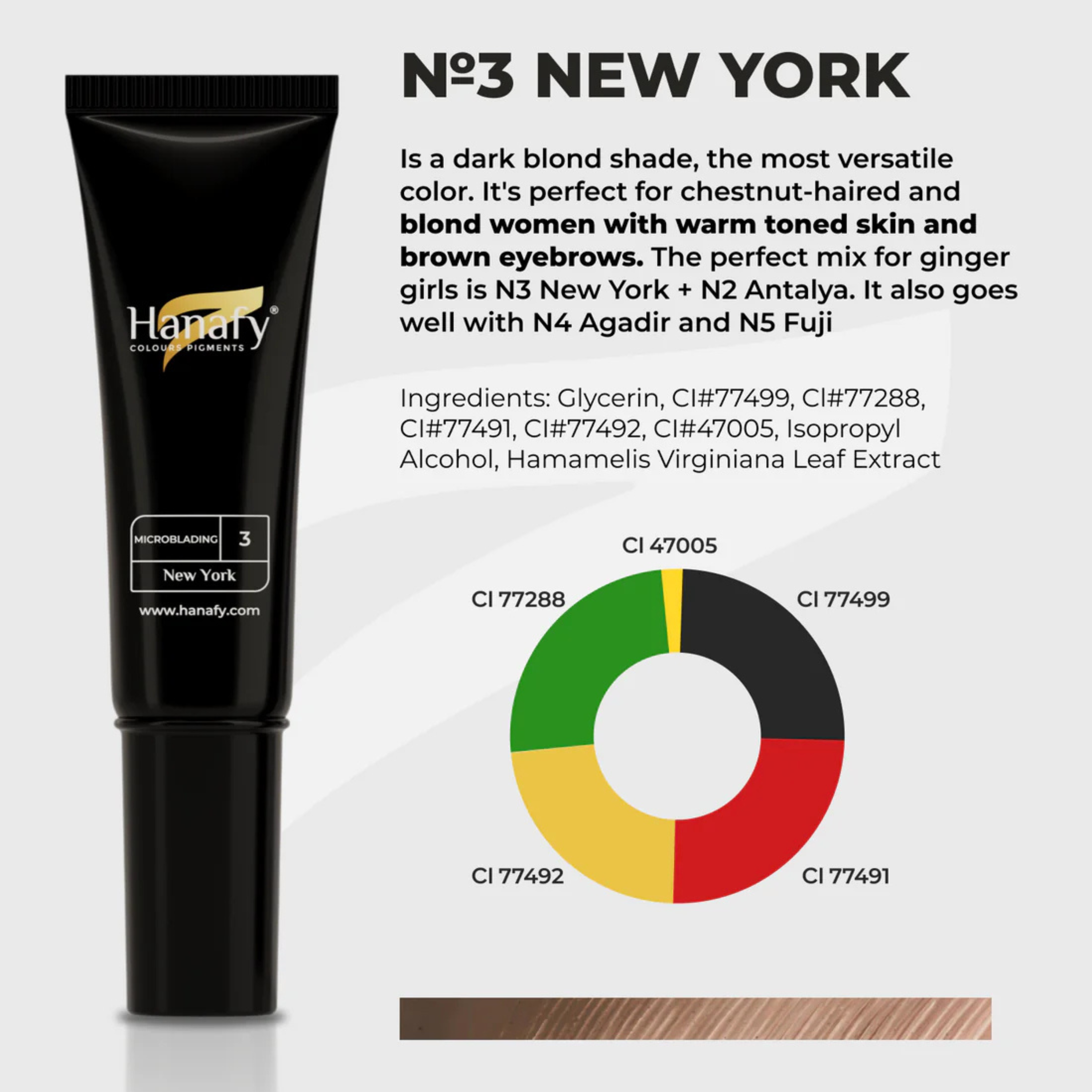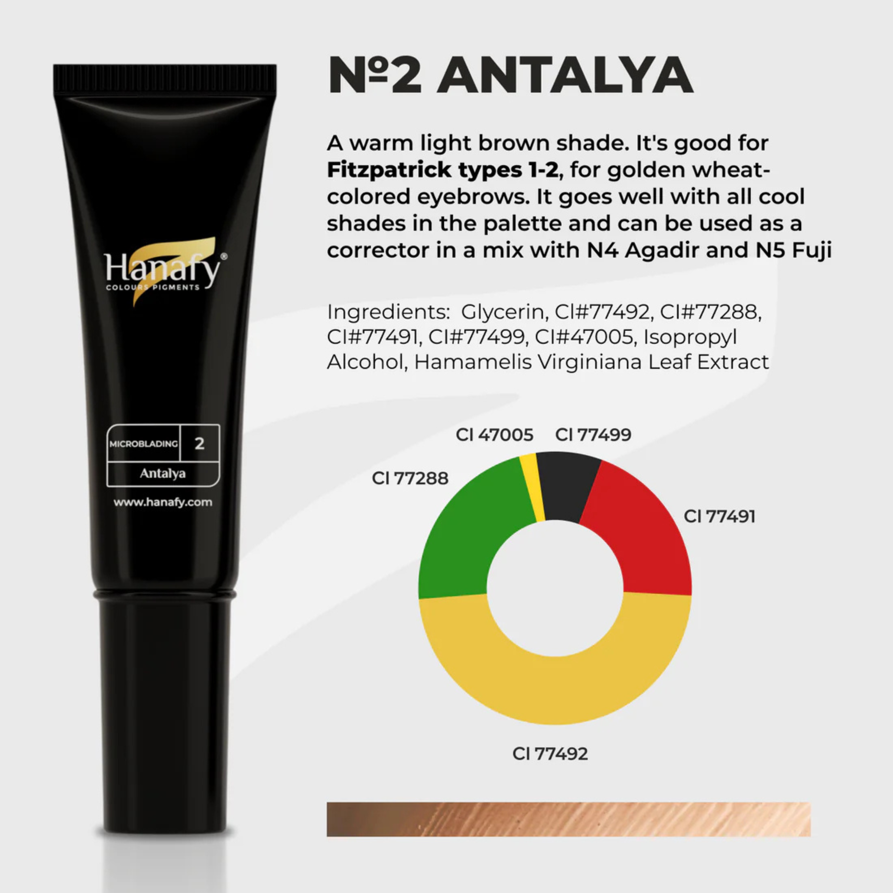 Nº2 «Antalya» – Marrón claro cálido, adecuado para tonos trigo, se mezcla bien con pigmentos fríos. Puede usarse como corrector en mezcla con el Nº4 y Nº5