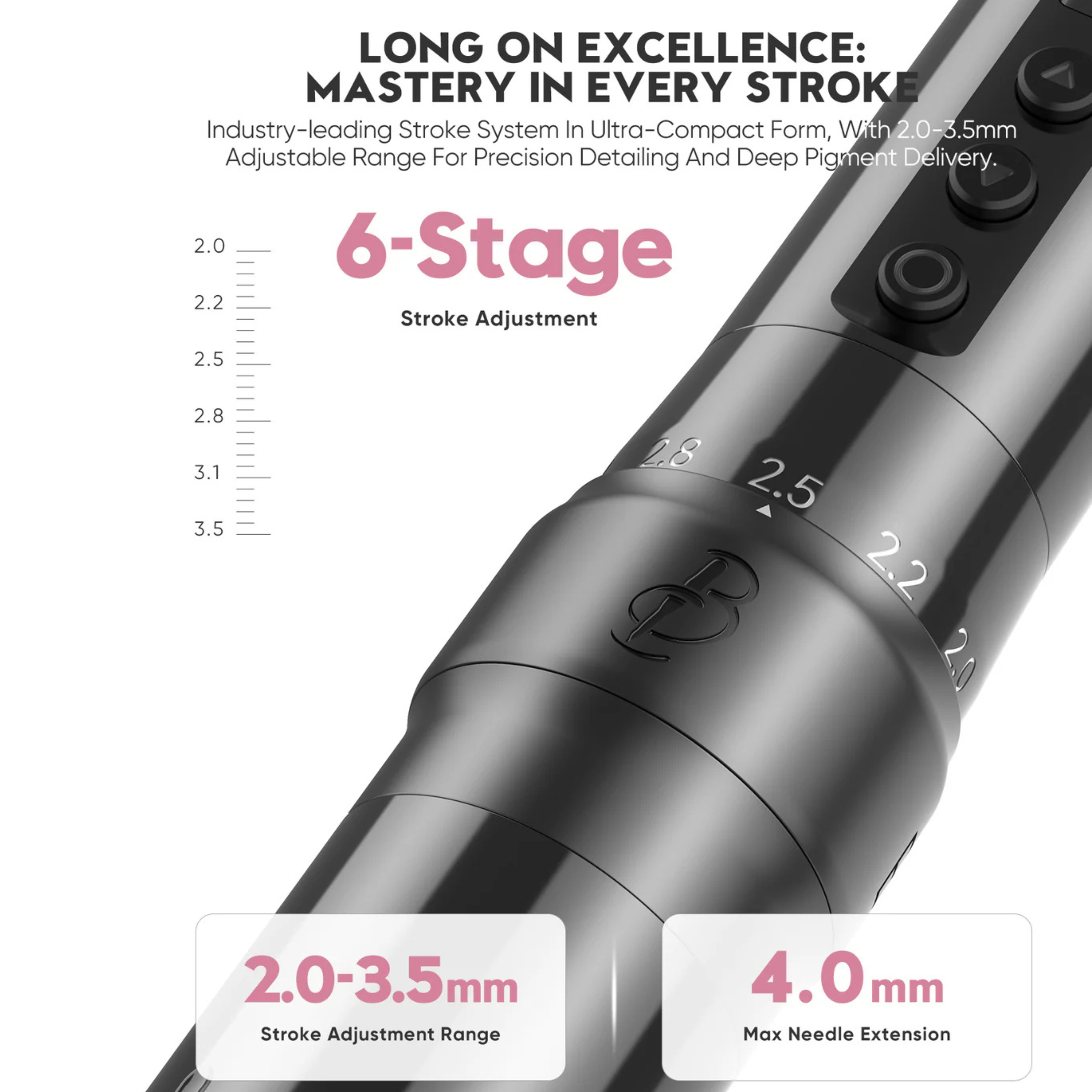 El dispositivo cuenta con un ajuste de trazo versátil de 6 niveles (de 2,0 mm a 3,5 mm) , lo que permite transiciones perfectas en todos los procedimientos de micropigmentación. Desde delicados trazos que imitan el vello hasta líneas definidas, el U1 Pro ofrece la precisión necesaria con un mínimo traumatismo cutáneo.
