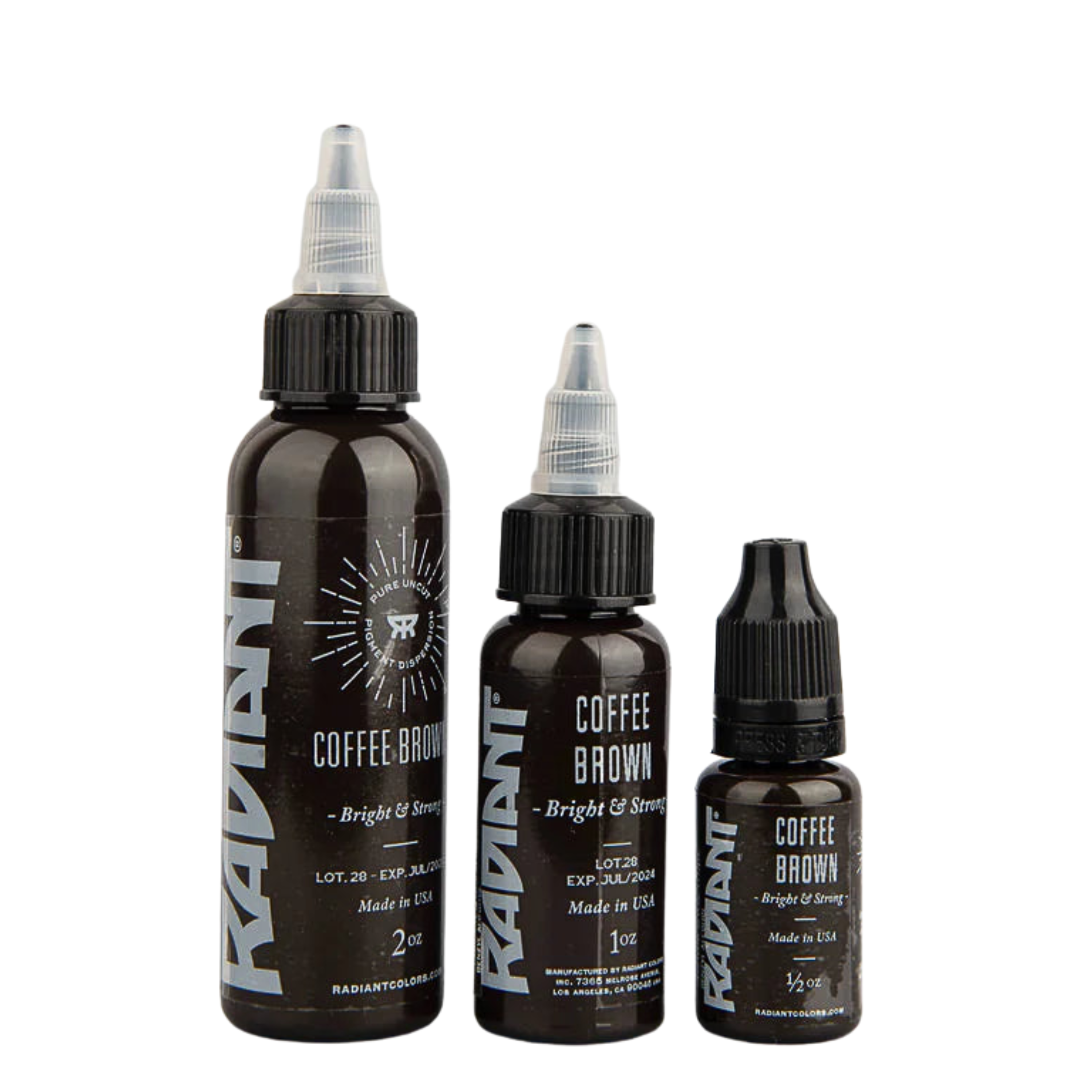 La tinta de tatuaje Radiant Ink color marrón café está diseñada para ofrecer pigmentos de alta pureza, con una fórmula vegana y libre de crueldad animal. Su tono marrón intenso y brillante se mantiene estable con el paso del tiempo, garantizando resultados consistentes tanto en trazos como en rellenos.