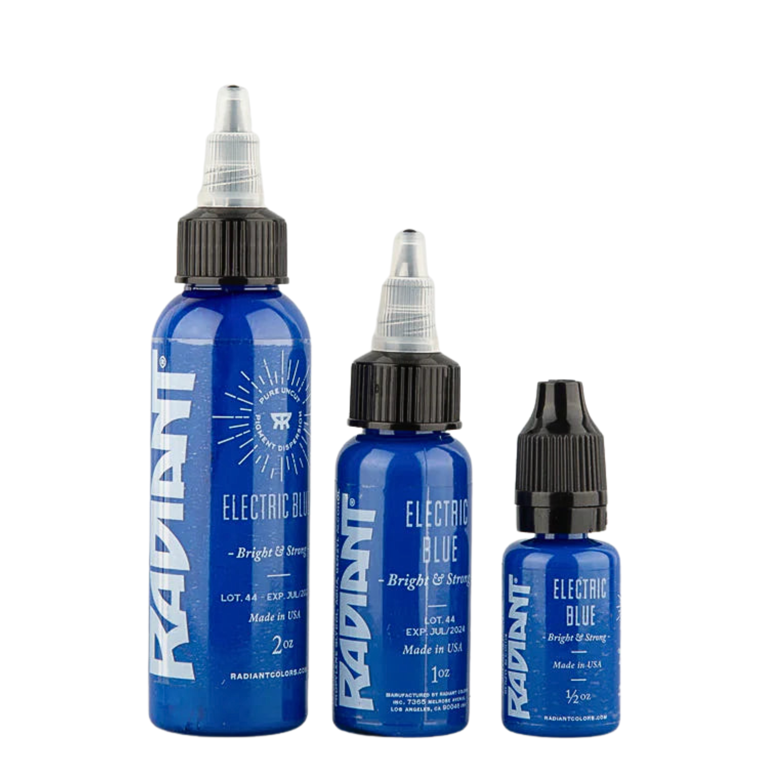 La tinta de tatuaje Radiant Ink color azul eléctrico está diseñada para ofrecer pigmentos de alta pureza, con una fórmula vegana y libre de crueldad animal. Su tono azul intenso y brillante se mantiene estable con el paso del tiempo, garantizando resultados consistentes tanto en trazos como en rellenos.