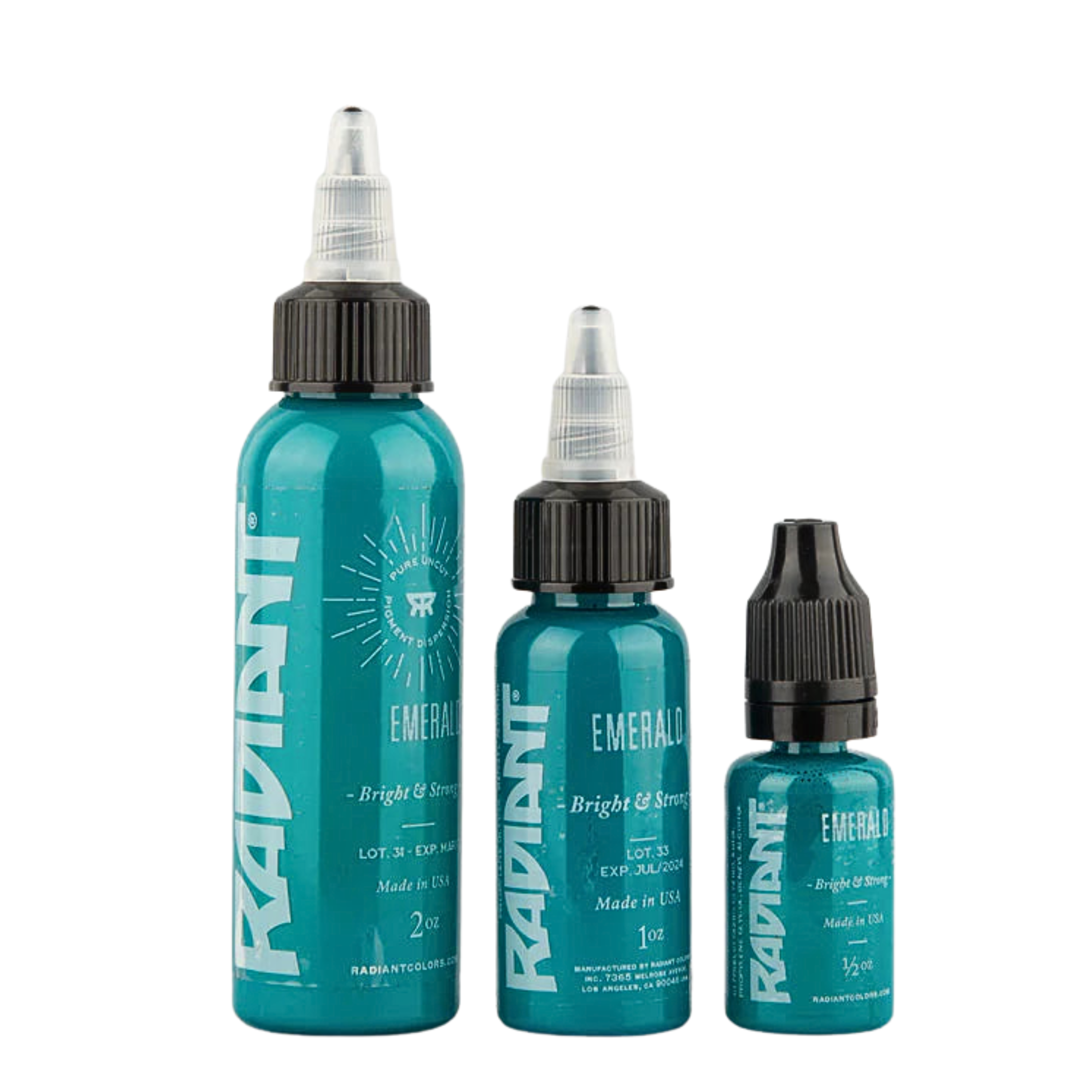 La tinta de tatuaje Radiant Ink color esmeralda está diseñada para ofrecer pigmentos de alta pureza, con una fórmula vegana y libre de crueldad animal. Su tono verde intenso y brillante se mantiene estable con el paso del tiempo, garantizando resultados consistentes tanto en trazos como en rellenos.