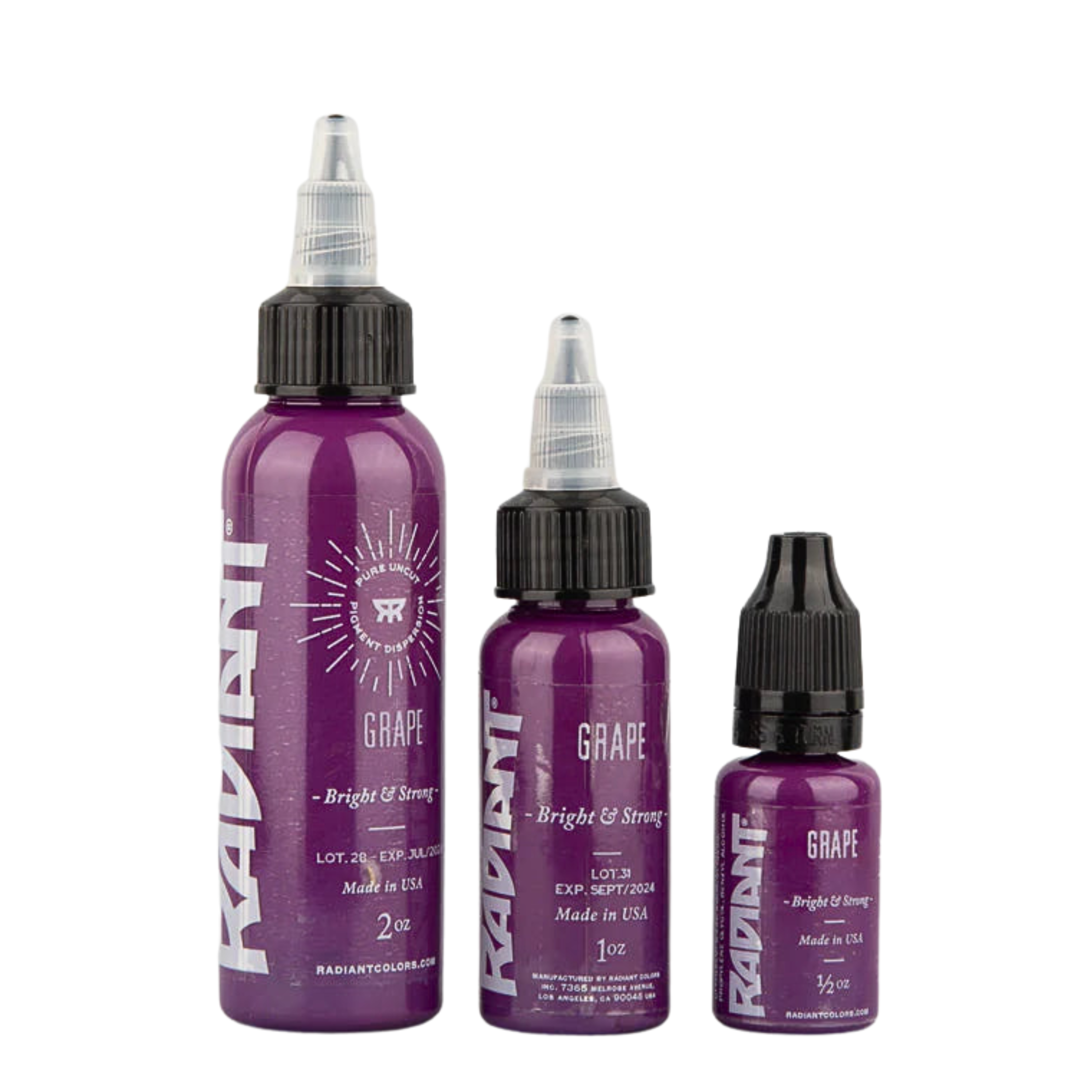 La tinta de tatuaje Radiant Ink color uva está diseñada para ofrecer pigmentos de alta pureza, con una fórmula vegana y libre de crueldad animal. Su tono morado intenso y brillante se mantiene estable con el paso del tiempo, garantizando resultados consistentes tanto en trazos como en rellenos.