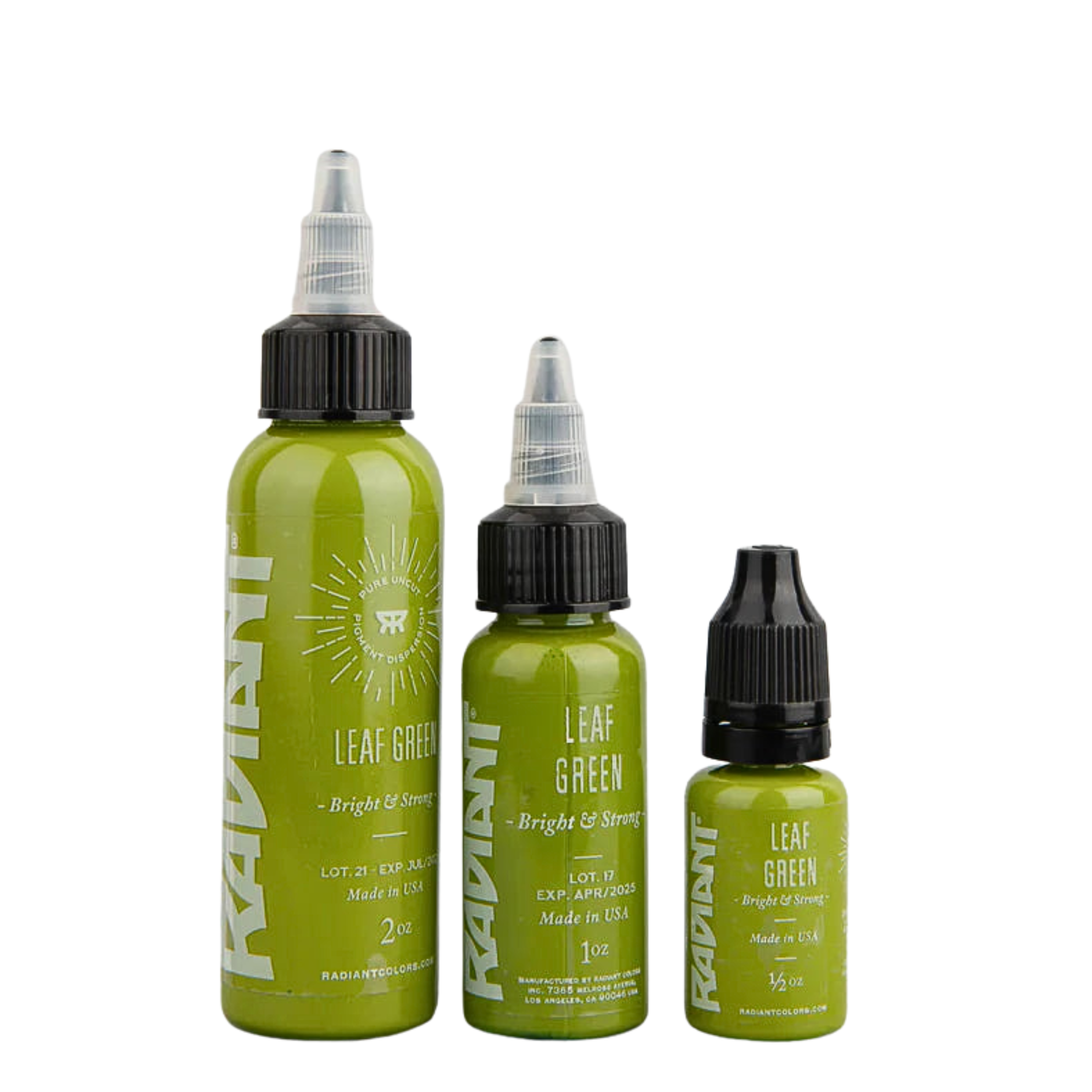 La tinta de tatuaje Radiant Ink color verde hoja está diseñada para ofrecer pigmentos de alta pureza, con una fórmula vegana y libre de crueldad animal. Su tono verde intenso y brillante se mantiene estable con el paso del tiempo, garantizando resultados consistentes tanto en trazos como en rellenos.
