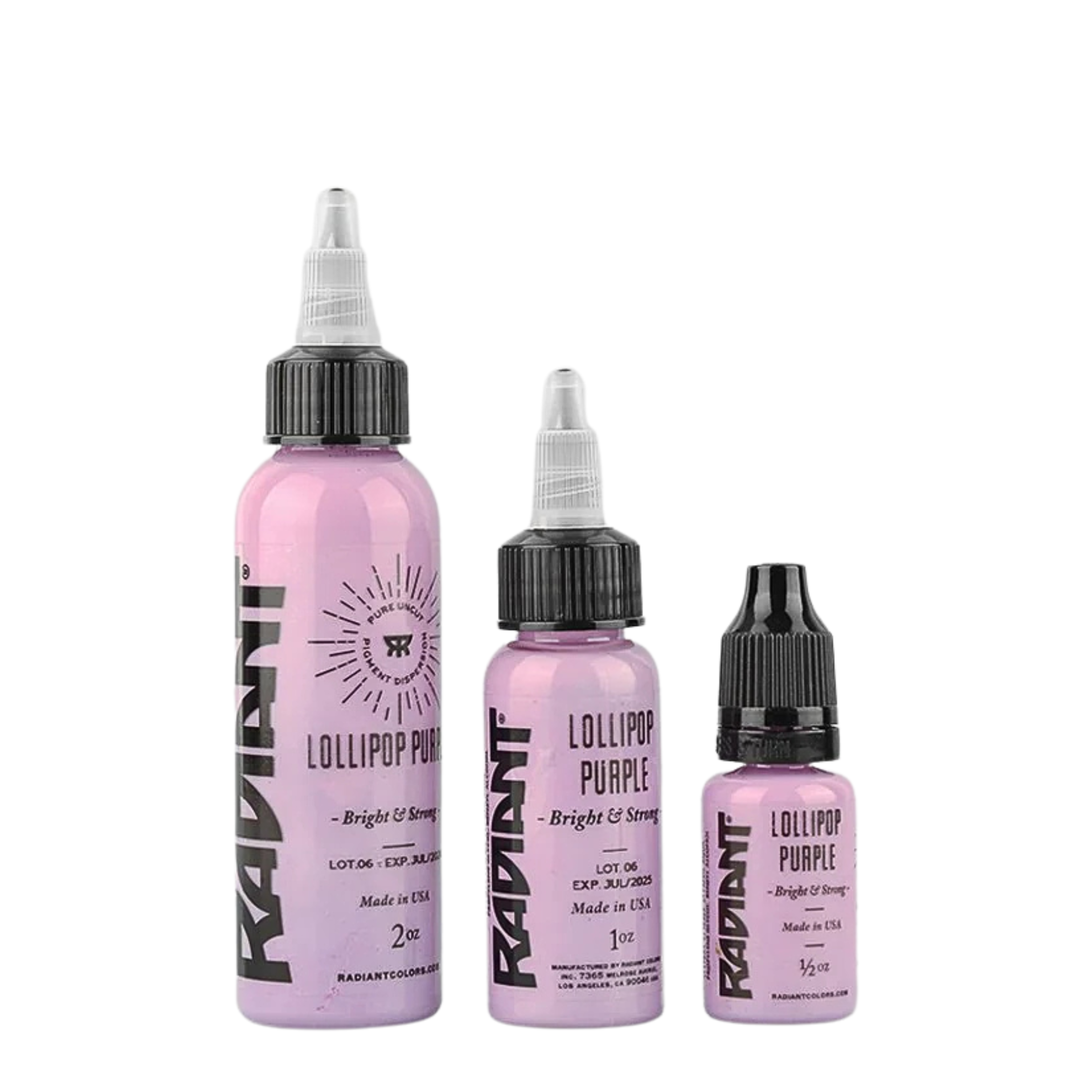 La tinta de tatuaje Radiant Ink color Lollipop Purple está diseñada para ofrecer pigmentos de alta pureza, con una fórmula vegana y libre de crueldad animal. Su tono amarillo intenso y brillante se mantiene estable con el paso del tiempo, garantizando resultados consistentes tanto en trazos como en rellenos.