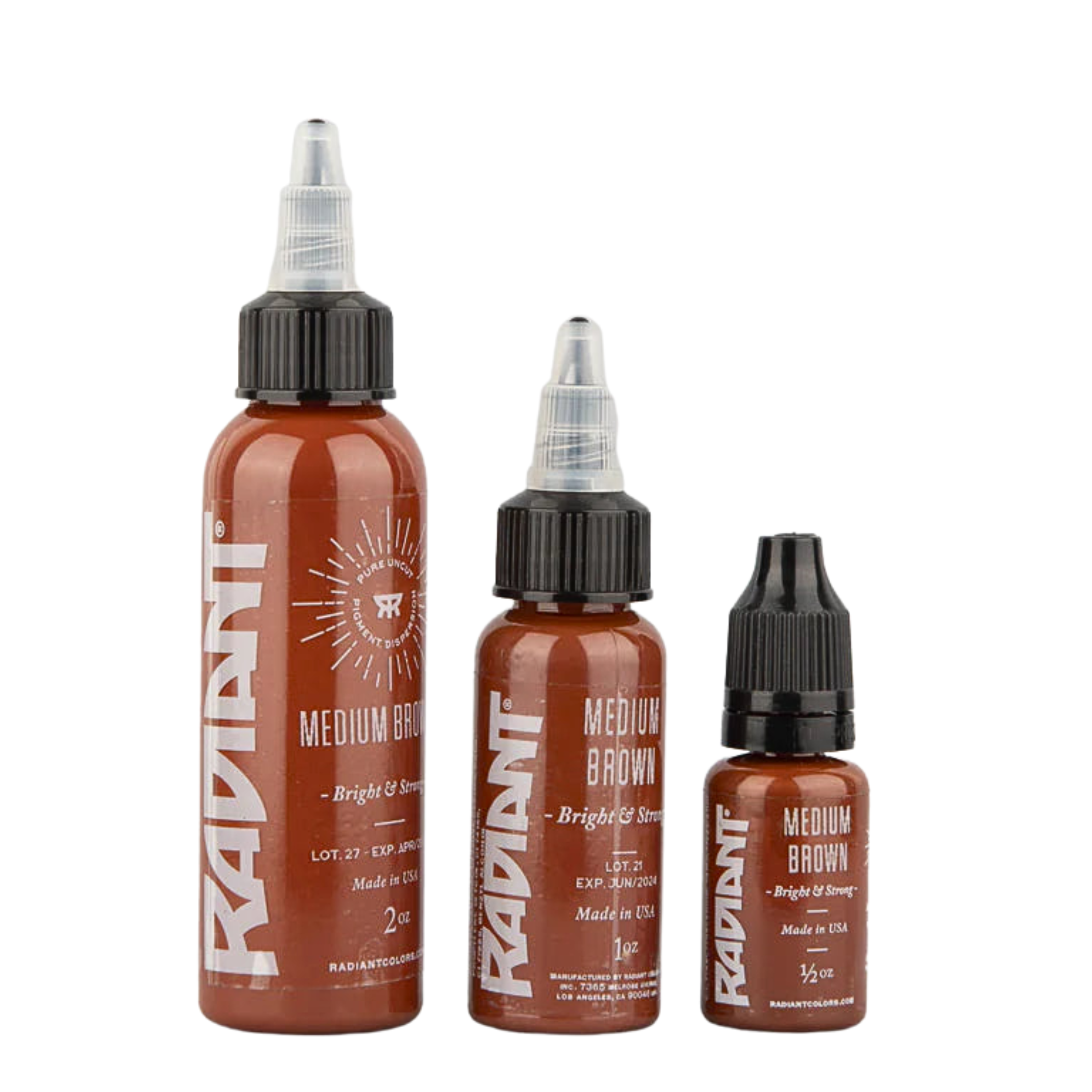 La tinta de tatuaje Radiant Ink color marrón medio está diseñada para ofrecer pigmentos de alta pureza, con una fórmula vegana y libre de crueldad animal. Su tono marrón intenso y brillante se mantiene estable con el paso del tiempo, garantizando resultados consistentes tanto en trazos como en rellenos.