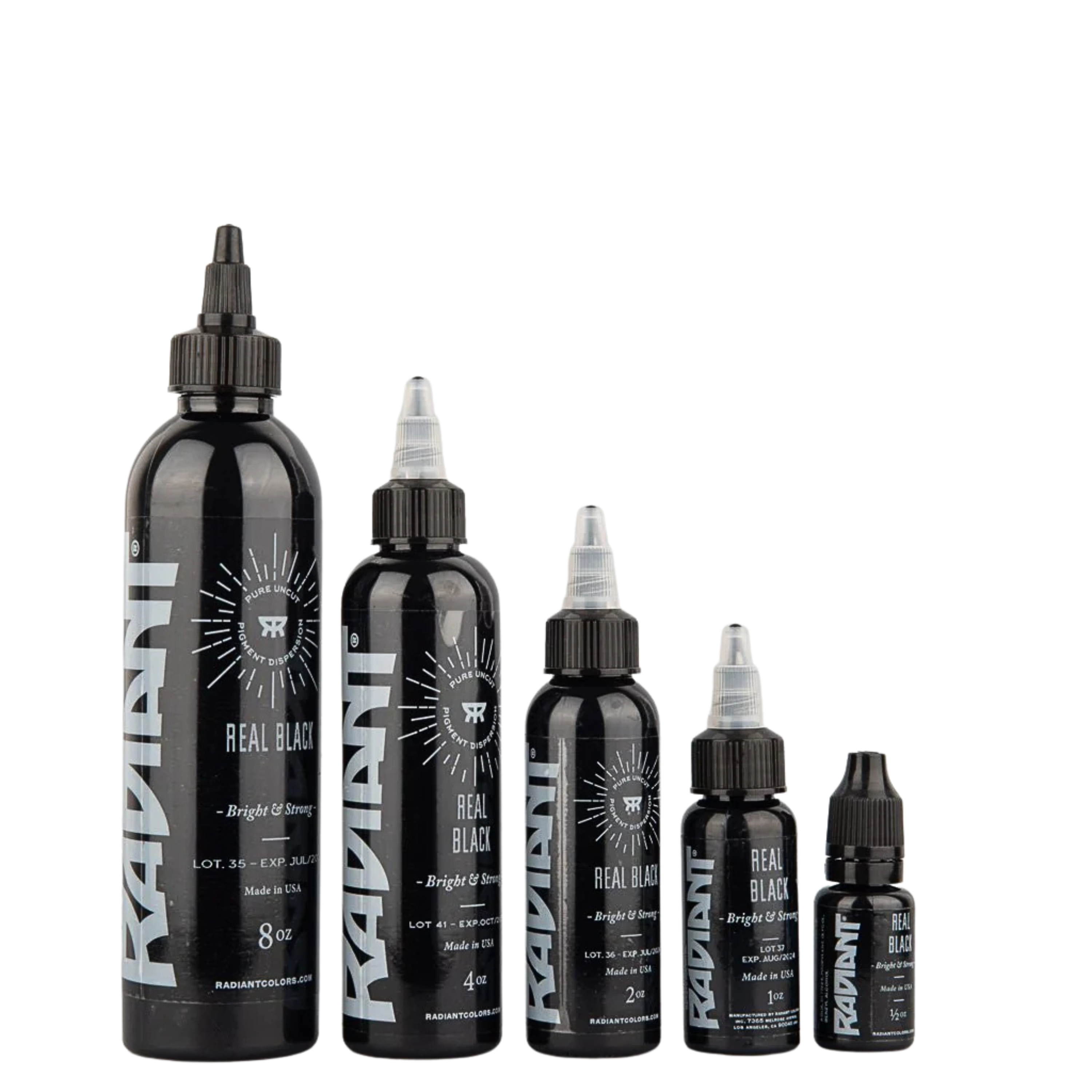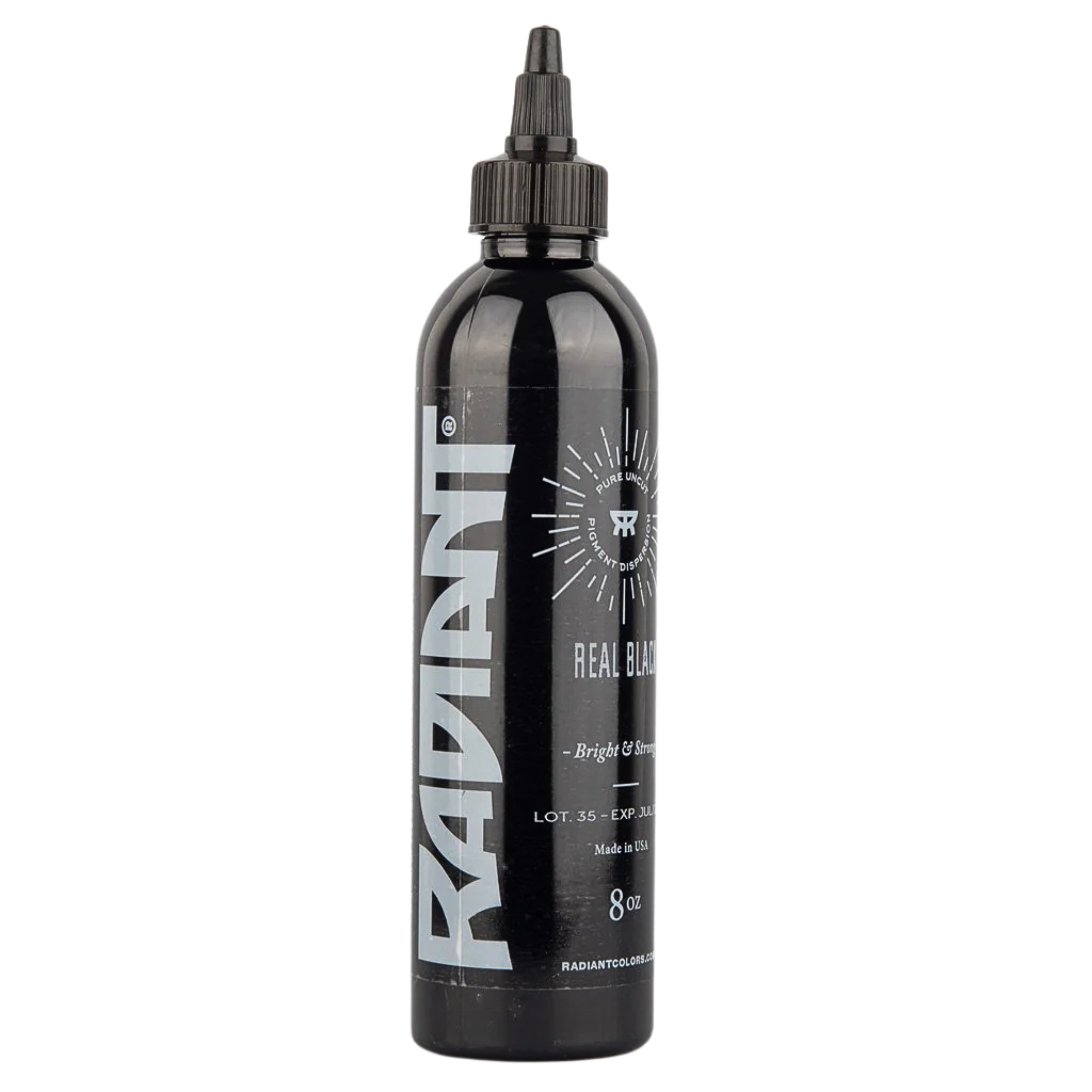 La Radiant Ink Real Black es la elección definitiva para tatuadores que buscan un negro puro, intenso y de alta fijación. Su fórmula de máxima pigmentación garantiza un depósito uniforme en la piel, facilitando la creación de líneas definidas, sombreados profundos y rellenos opacos.