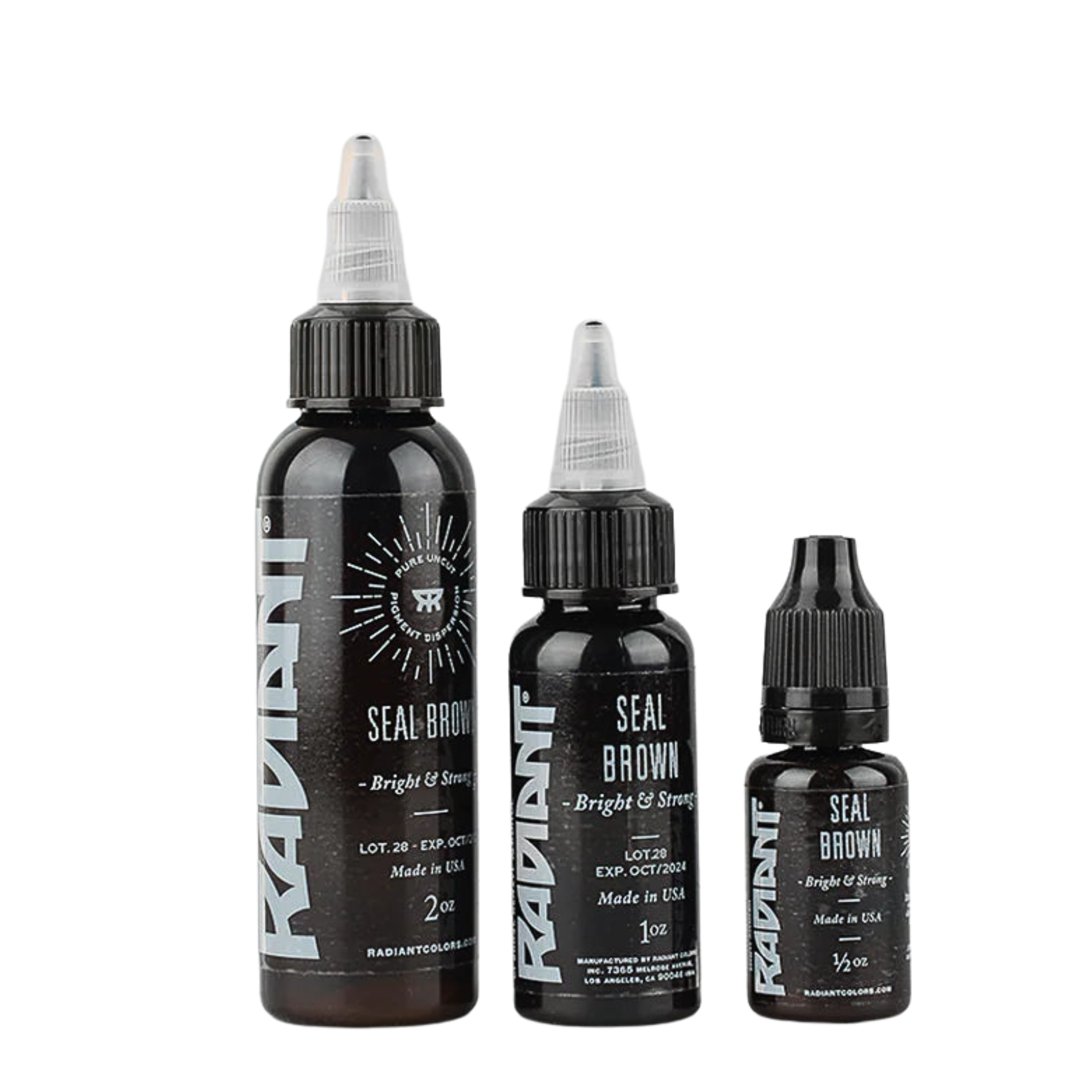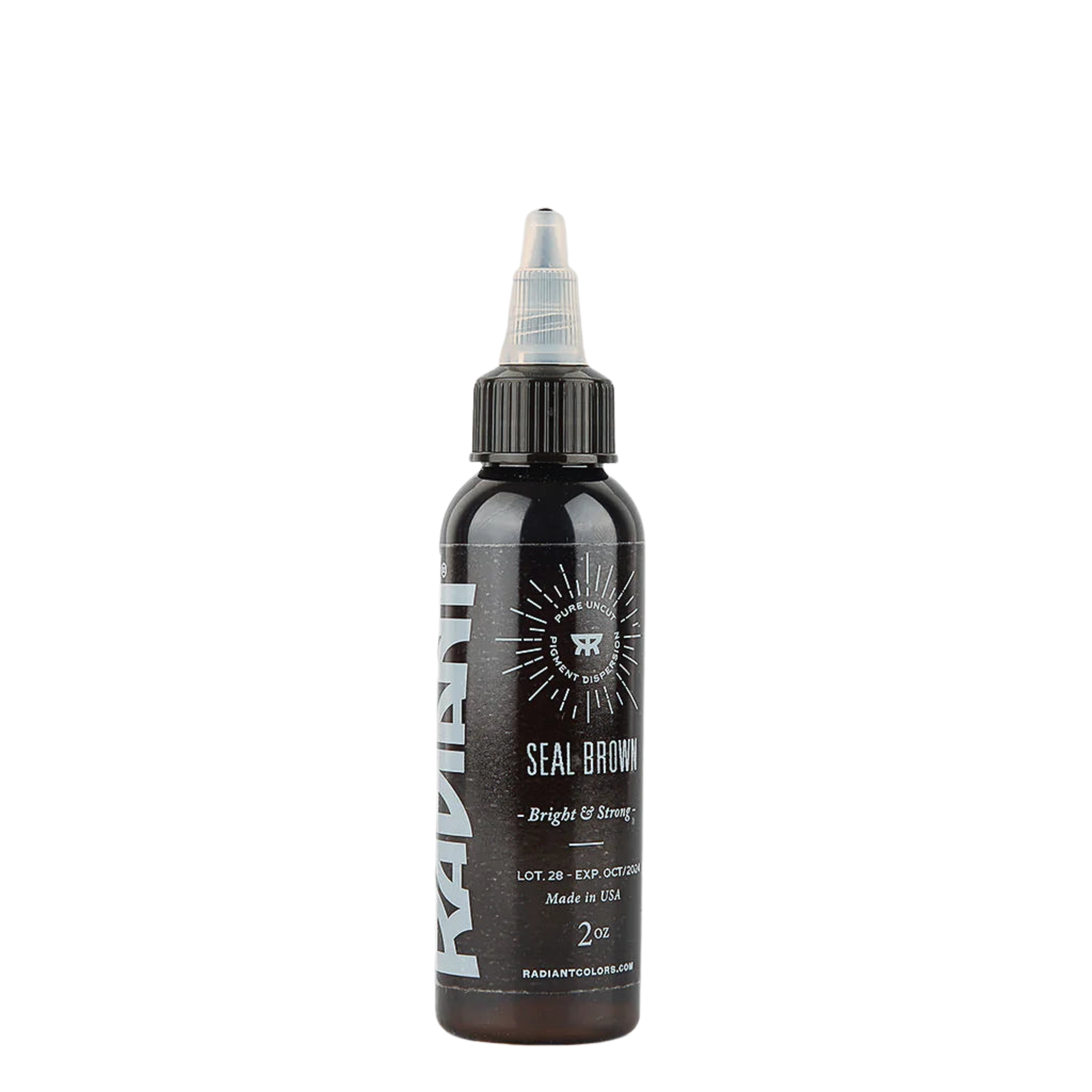 La tinta de tatuaje Radiant Ink color marrón foca está diseñada para ofrecer pigmentos de alta pureza, con una fórmula vegana y libre de crueldad animal. Su tono marrón intenso y brillante se mantiene estable con el paso del tiempo, garantizando resultados consistentes tanto en trazos como en rellenos.