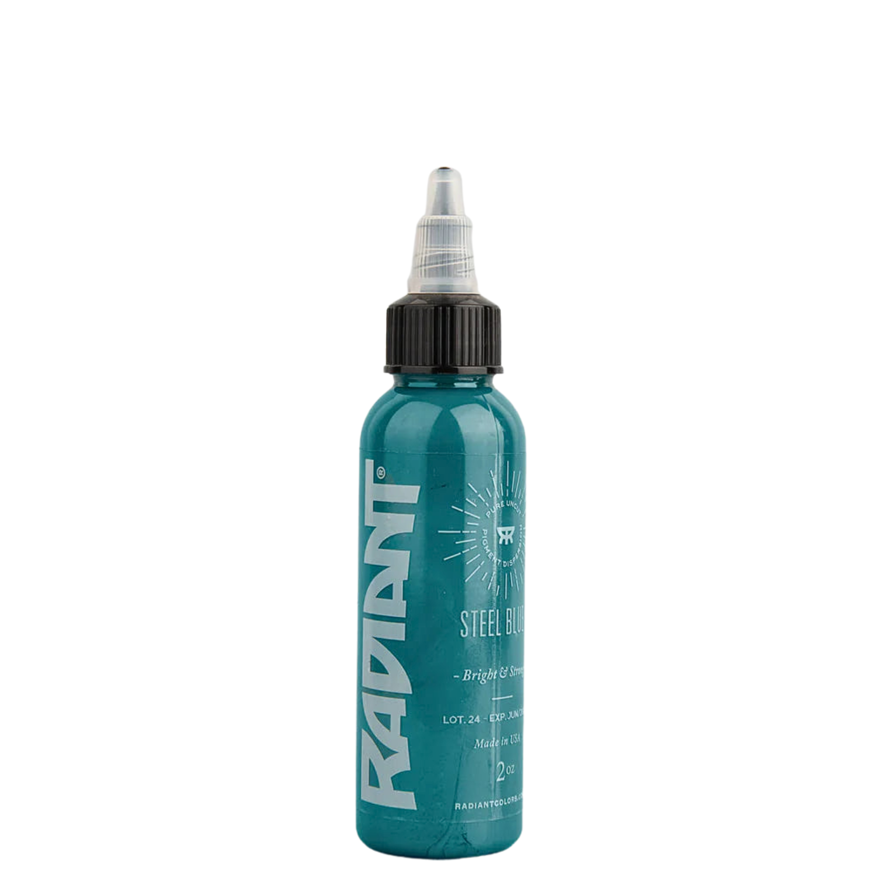La tinta de tatuaje Radiant Ink color azul acero está diseñada para ofrecer pigmentos de alta pureza, con una fórmula vegana y libre de crueldad animal. Su tono azul intenso y brillante se mantiene estable con el paso del tiempo, garantizando resultados consistentes tanto en trazos como en rellenos.
