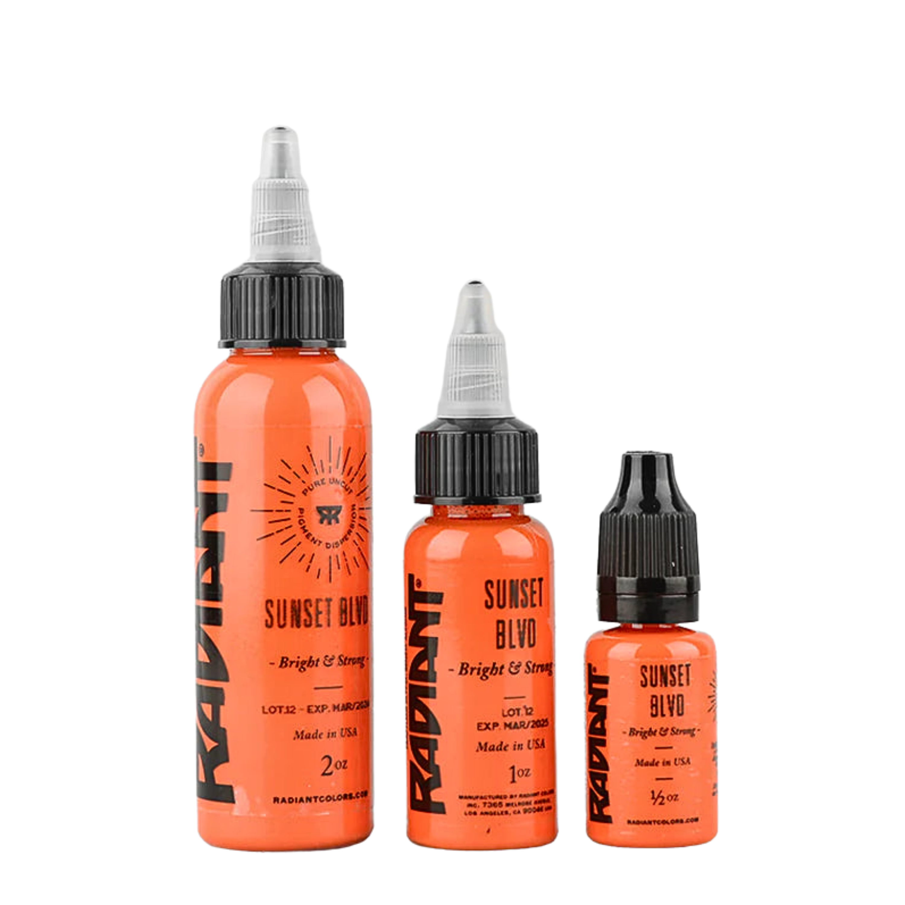 La tinta de tatuaje Radiant Ink color atardecer está diseñada para ofrecer pigmentos de alta pureza, con una fórmula vegana y libre de crueldad animal. Su tono tono intenso y brillante se mantiene estable con el paso del tiempo, garantizando resultados consistentes tanto en trazos como en rellenos.