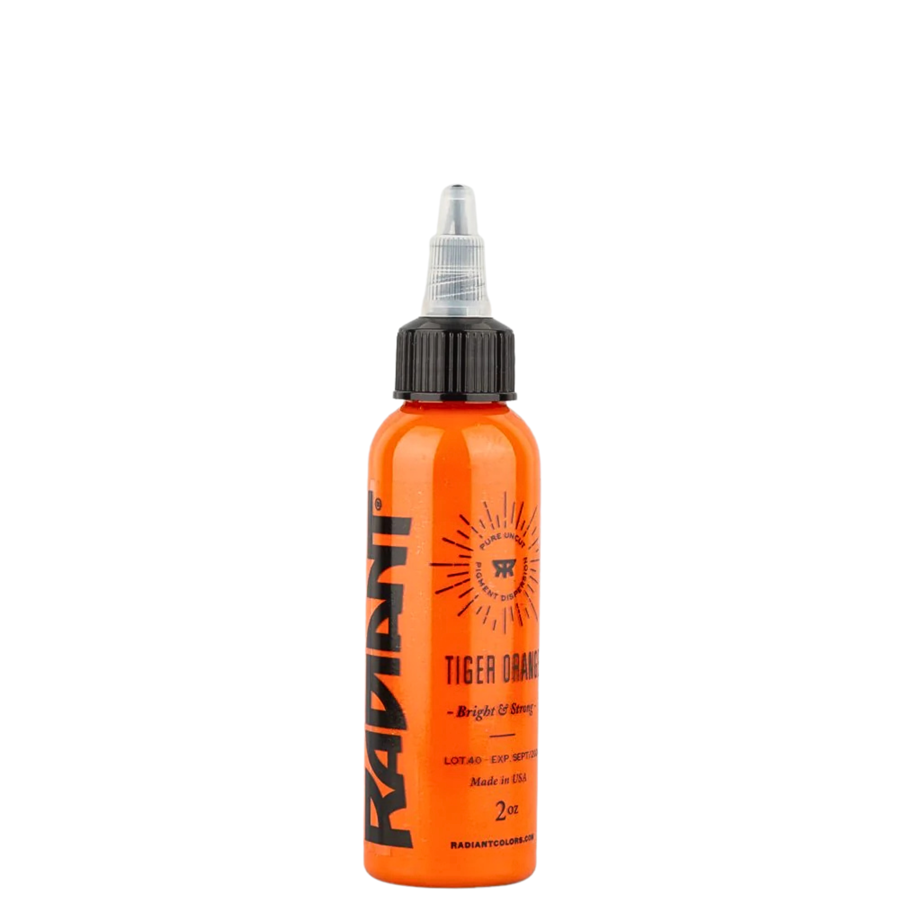 La tinta de tatuaje Radiant Ink color naranja brillante está diseñada para ofrecer pigmentos de alta pureza, con una fórmula vegana y libre de crueldad animal. Su tono azul intenso y brillante se mantiene estable con el paso del tiempo, garantizando resultados consistentes tanto en trazos como en rellenos.