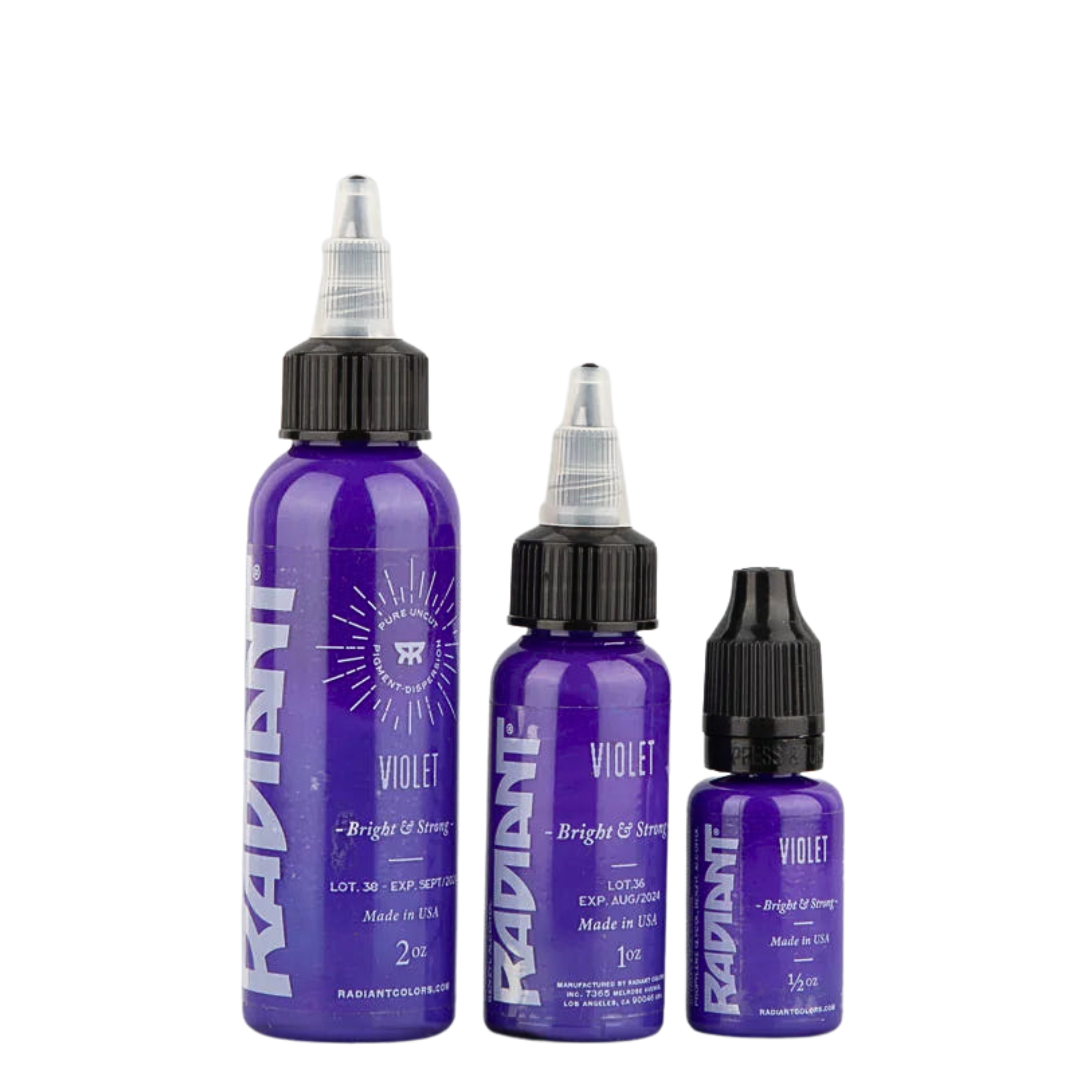 La tinta de tatuaje Radiant Ink color violeta está diseñada para ofrecer pigmentos de alta pureza, con una fórmula vegana y libre de crueldad animal. Su tono morado intenso y brillante se mantiene estable con el paso del tiempo, garantizando resultados consistentes tanto en trazos como en rellenos.